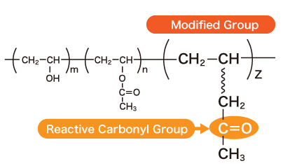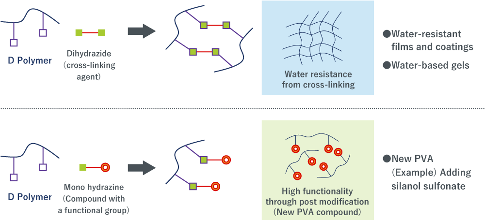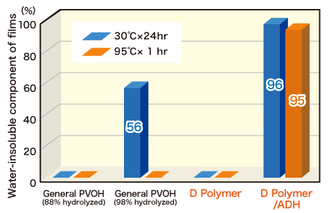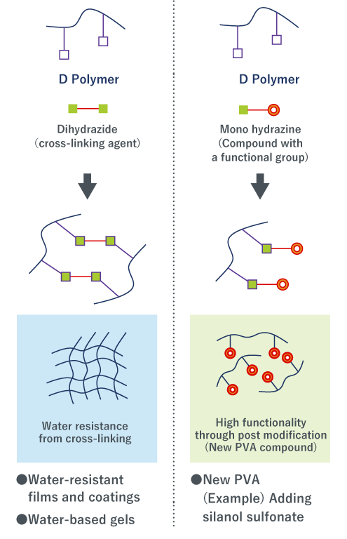 D Polymer is a PVOH that has highly reactive “carbonyl groups” as a modified group other than the hydroxyl and acetate groups. The carbonyl group reacts with hydrazide groups and amino groups and in particular it has an especially high reactivity with hydrazide base cross-linking agents, and it can also form coatings and films that do not dissolve even in boiling water. It can be used to produce highly transparent gels.