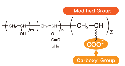 A Polymer is a modified POVAL containing carboxyl groups in addition to hydroxyl and acetate groups. Due to the presence of these anionic functional groups, it exhibits enhanced water solubility compared to general POVAL and enables applications that utilize the reactivity of the carboxyl groups.