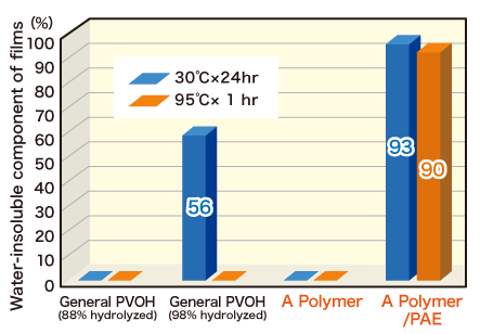 Cross-linked films of A Polymer with PAE resin are insoluble even in hot water. For water-resistant films, we recommend the newly commercialized ALT-17 grade.